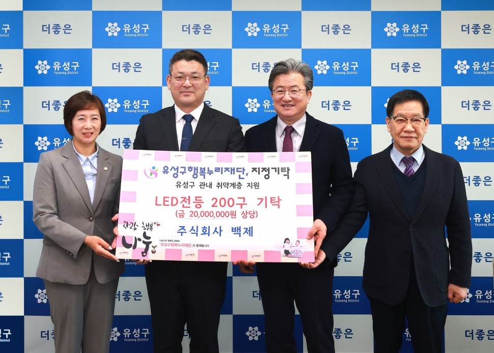 대전 유성구(구청장 정용래)는 27일 ㈜백제(대표 윤재균)가 2,000만 원 상당의 LED 전등을 유성구행복누리재단에 기탁했다고 밝혔다.