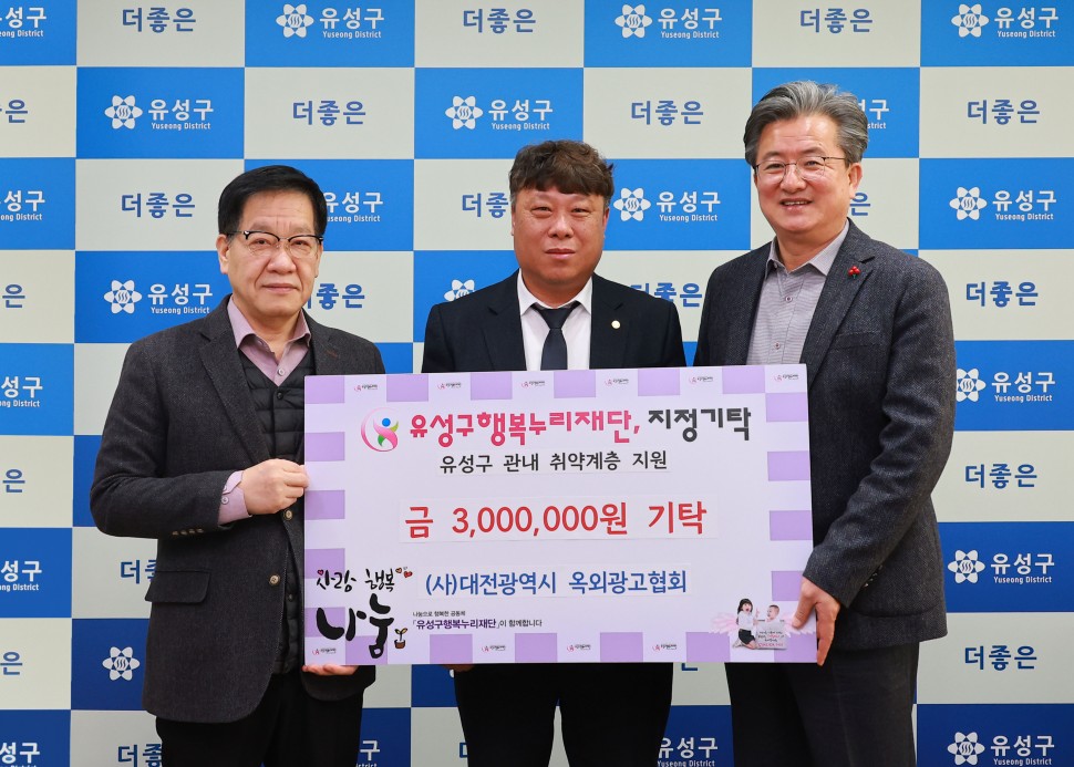 대전 유성구(구청장 정용래)는 지난 20일 (사)대전광역시 옥외광고협회(회장 양현만)에서 후원금 300만원을 유성구 행복누리재단에 기탁했다고 밝혔다.