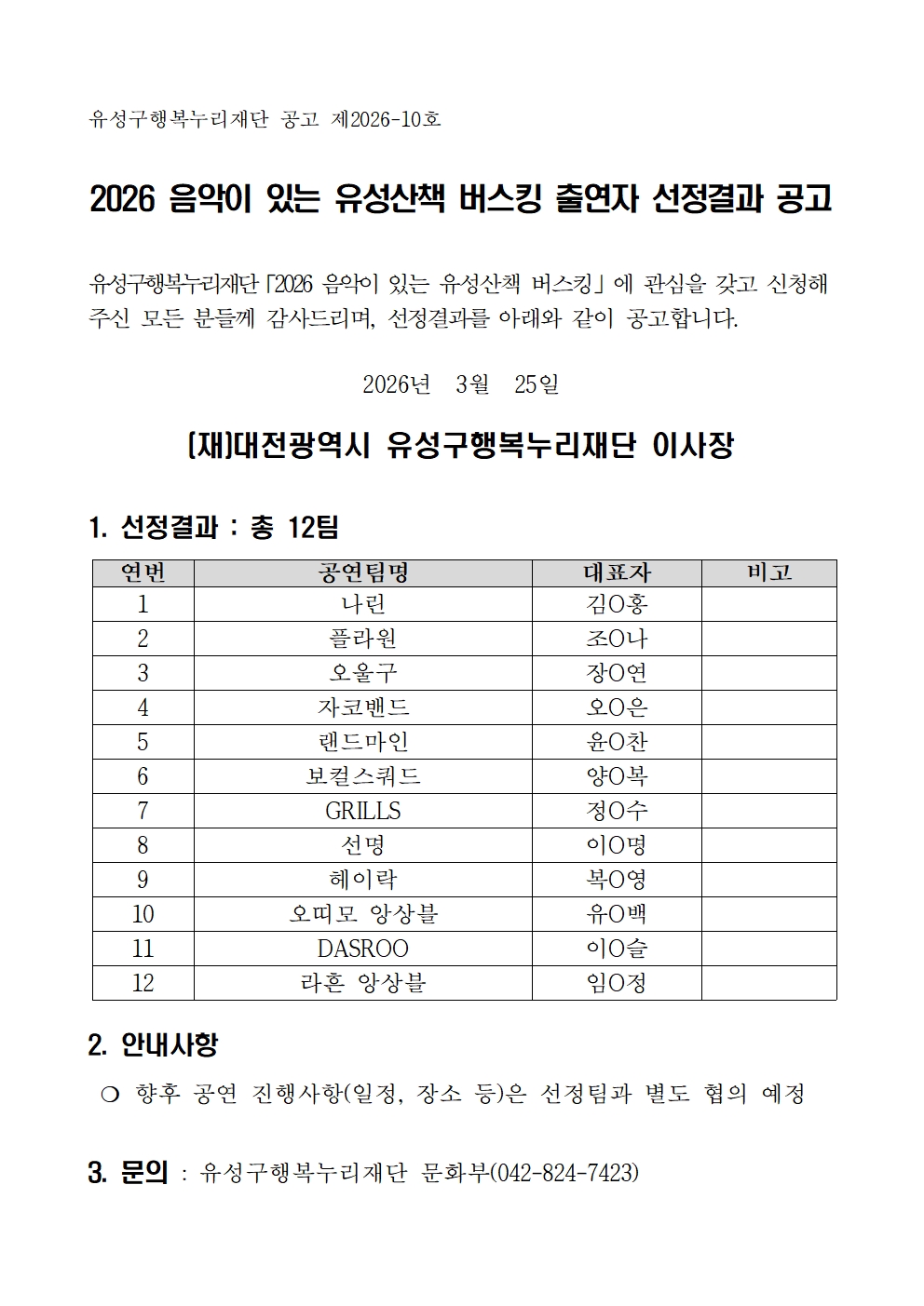 2026 음악이 있는 유성산책 버스킹 출연자 선정결과 공고